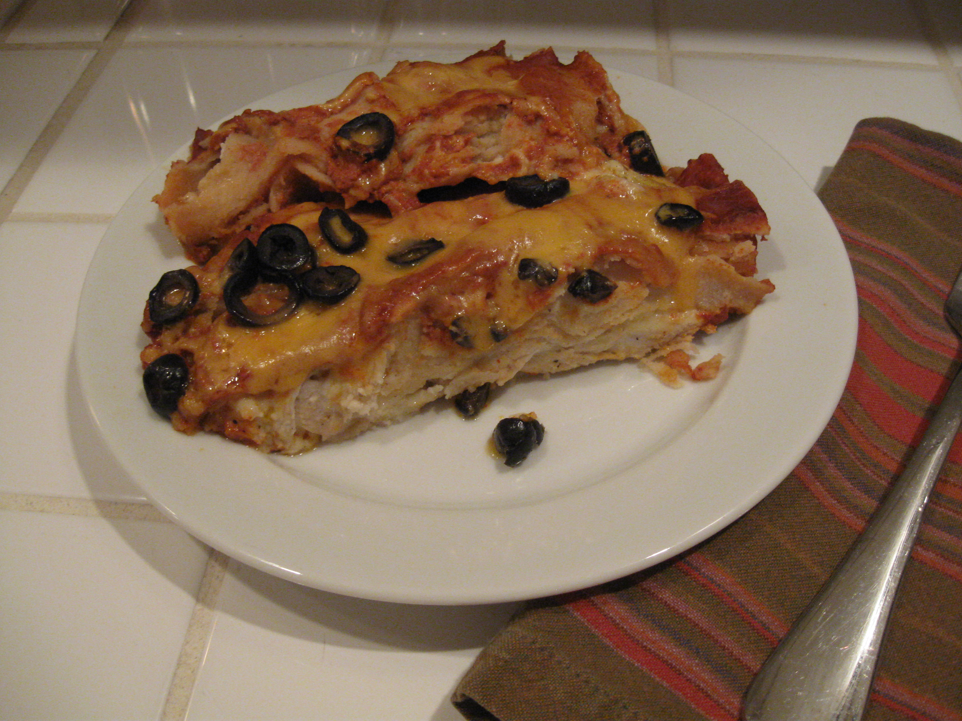 Mix ½ cup sour cream with the enchilada sauce and pour over the top of the stuffed tortillas.  Top with cheddar cheese and olives.  Bake for 20-25 minutes, until the cheese is melted.