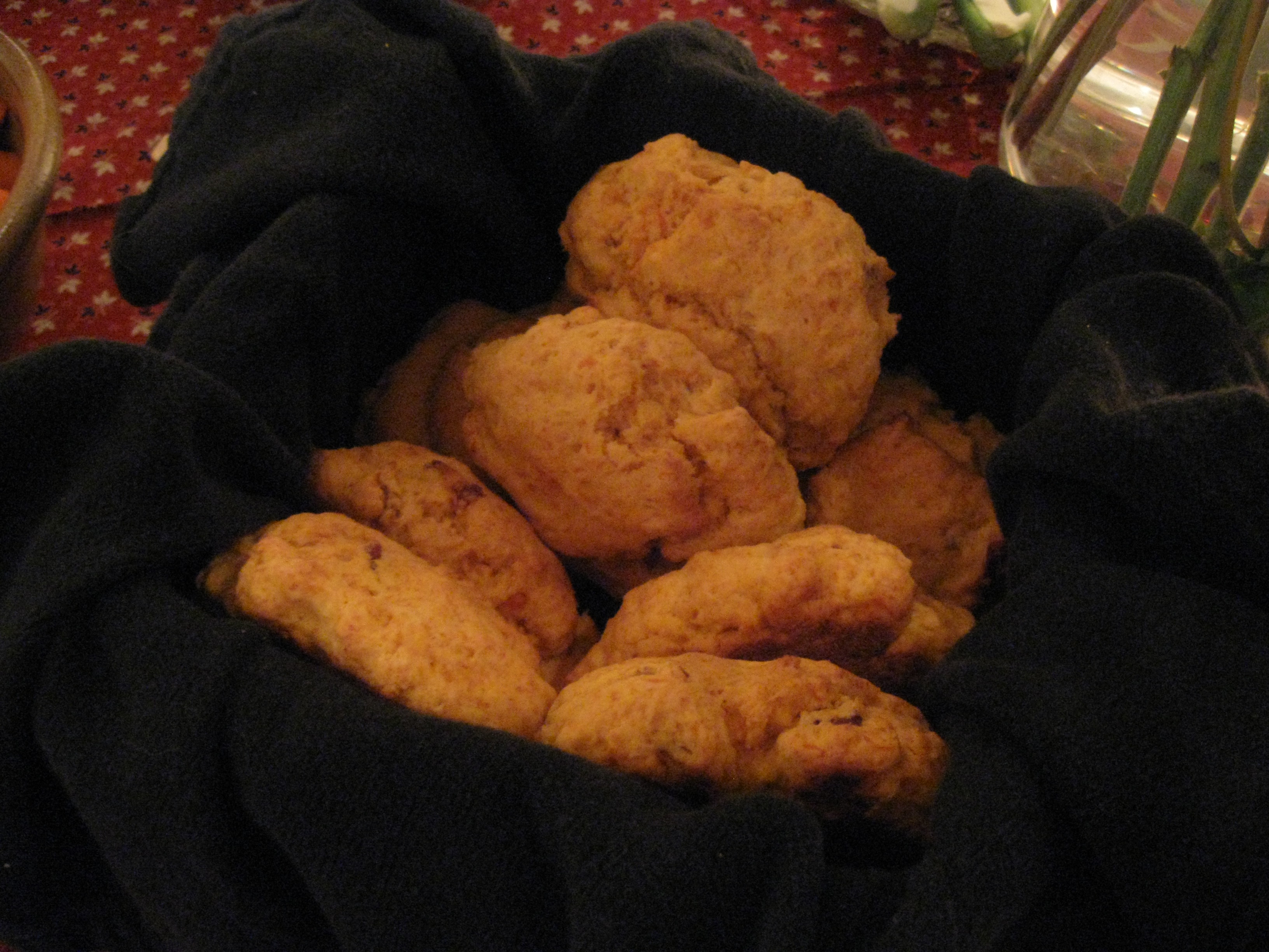 I think it’s now safe to say that I like sweet potatoes – as long as they’re in a biscuit. I don’t have a biscuit cutter so I rolled and flattened the drop versions and they turned out nice and light and fluffy, just the way a biscuit should be.