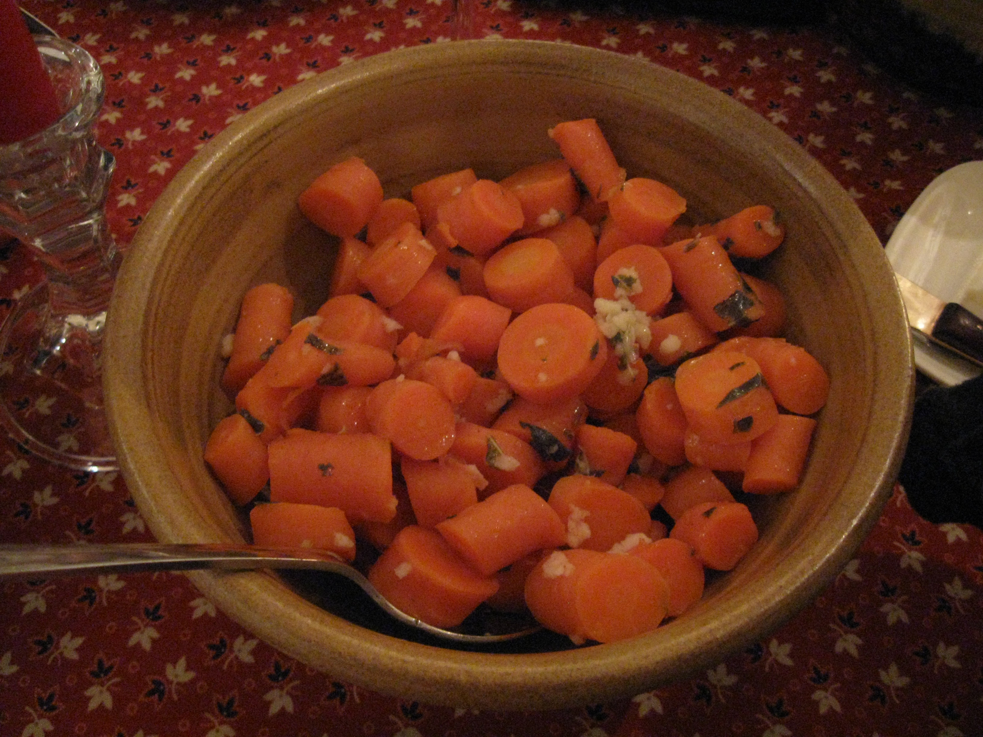 The “dressing” used on the warm carrot salad is great the first day – a little too garlicky the next. It’s a combination of crushed mint, chopped garlic, olive oil and lemon juice which really brings out the carrot flavor but makes for some pretty bad breath the next day.