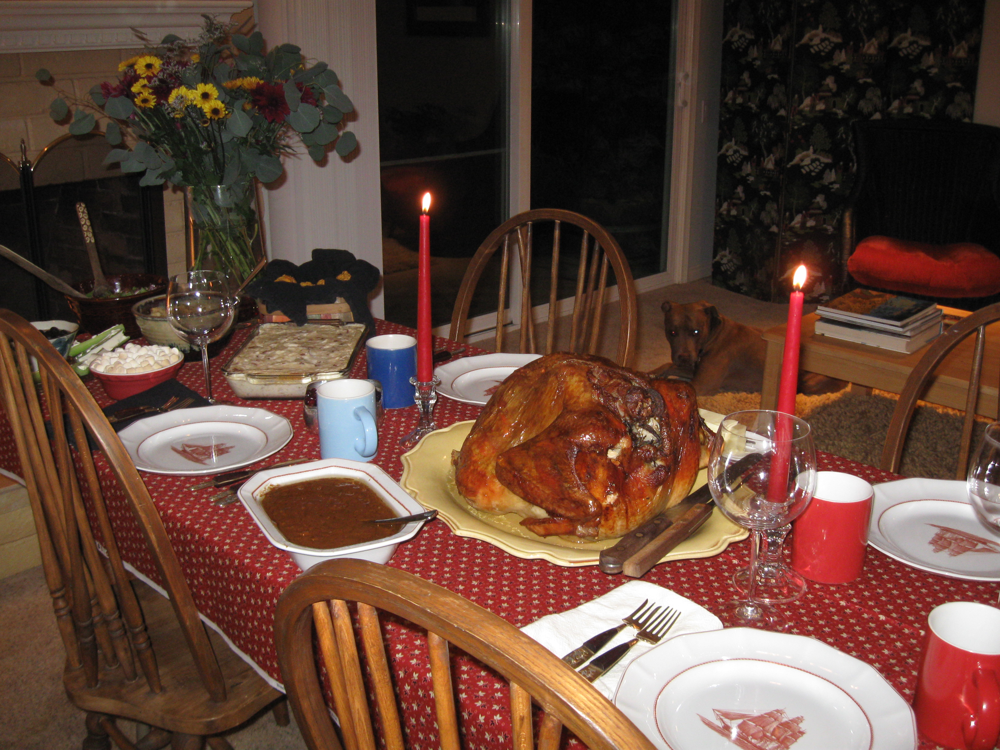 Here is the view Joel had from the head of the table. I’m not sure if I will ever roast a turkey again without brining it first. It was so moist and tender. It was a little salty though, so I’m glad I didn’t salt too many of the side dishes.