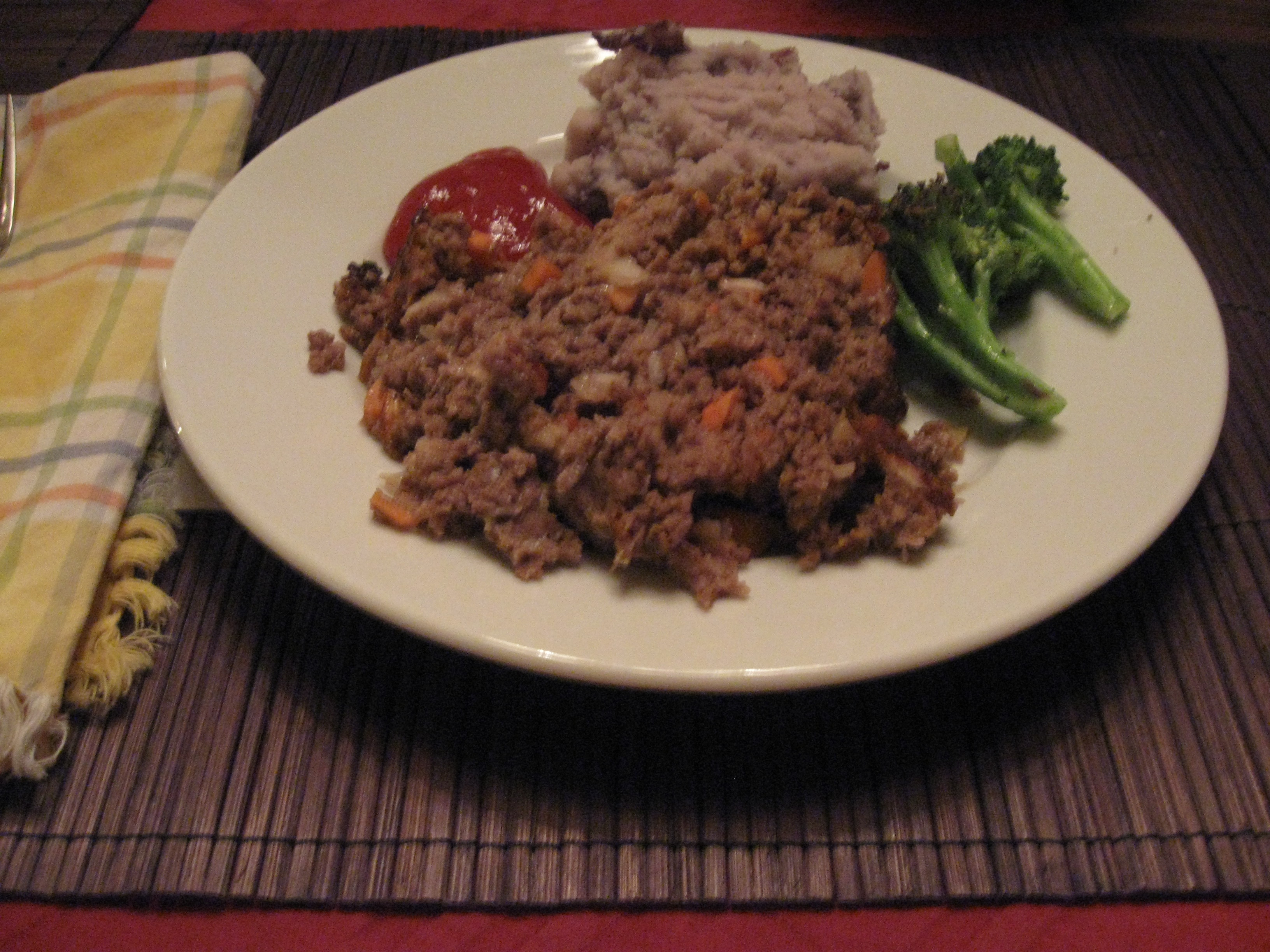 As it turns out, it wasn’t half bad. Apparently, a lot of ketchup goes a long way in making up for flavoring with spices. Who knew? The texture was light and fluffy, not what you’d expect from a meatloaf and I’m guessing that’s because of all of the breadcrumbs in the recipe. (We used fresh breadcrumbs instead of canned – BIG DIFFERENCE.) But it definitely wasn’t the “gourmet” version I had become accustomed to making.