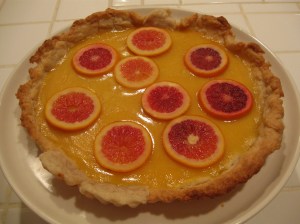 I decided that I wanted to try a blood orange tart so I cobbled together recipes from three cookbooks to create my first Blood Orange Tart with Candied Citrus. Here is the final result: