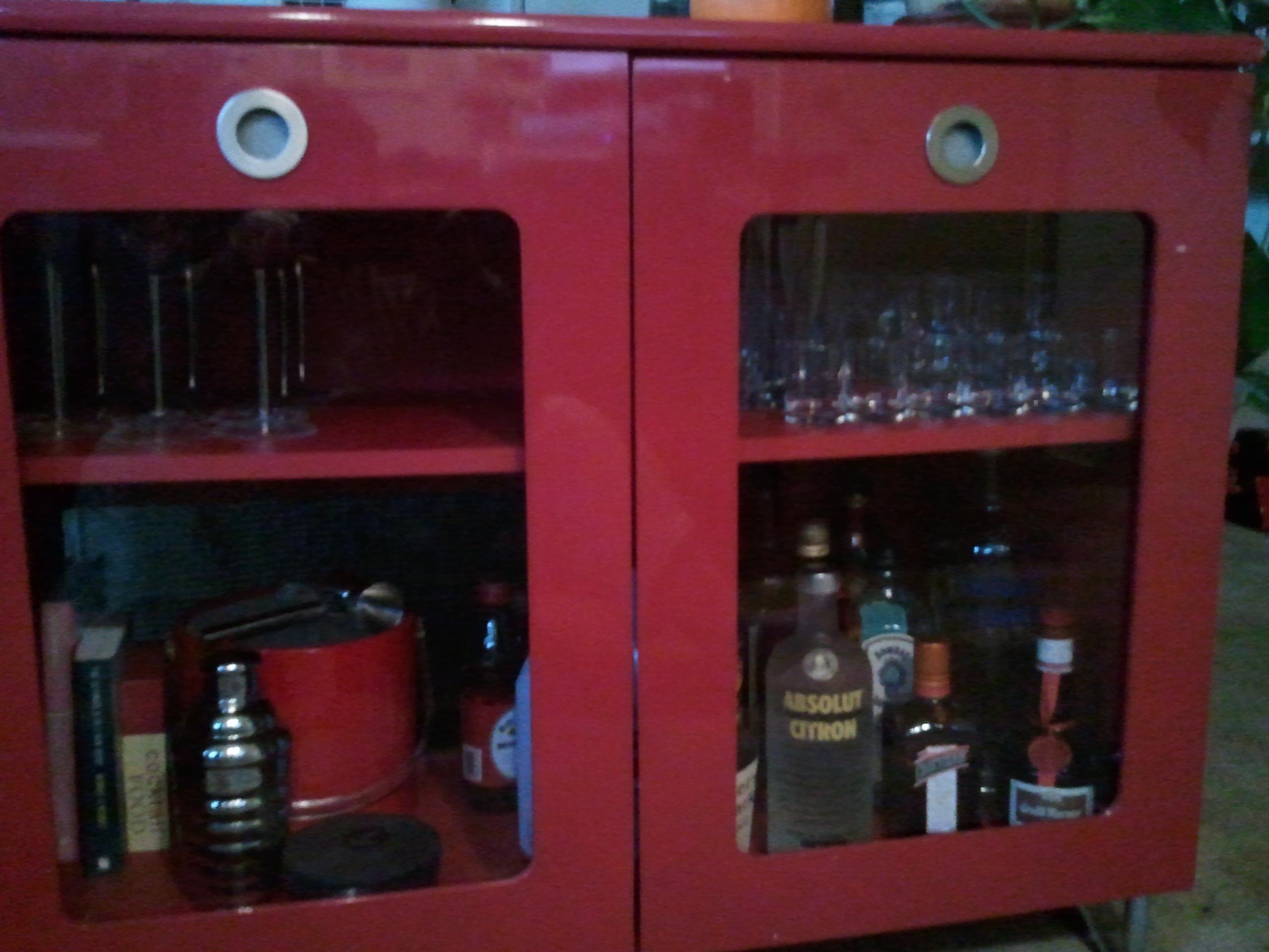 So my dream of finally having my own bar was realized, (and inspired by a recent Mad Men marathon.)  I re-purposed my old red lacquer television stand and purchased shot glasses, Highballs and Double Old-Fashioned glassware.  (I’ve yet to find the perfect Martini glasses.)  I moved the champagne flutes out of the wine cupboard and stored those in the bar as well.